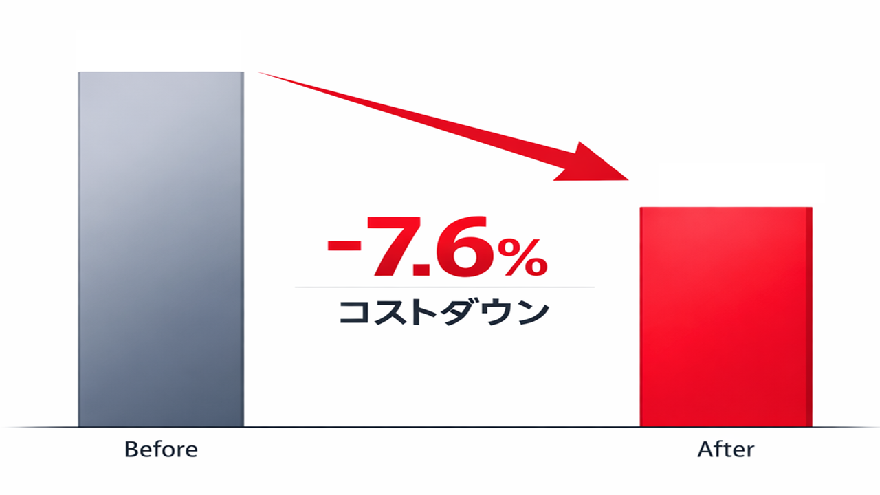 これらの効果によって主要課題であった「コスト管理の不十分さ」と「サプライヤ個別対応の業務コストの大きさ」に対して大きな効果を発揮し、特に「コスト管理の不十分さ」については導入後に約7.6%の物品コスト削減に繋げることが出来ました。